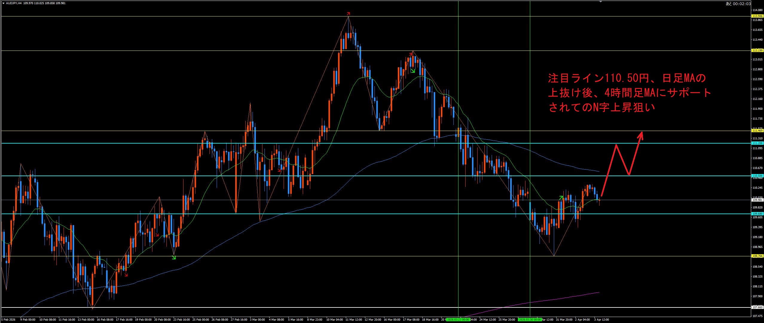 買い:4時間足ライン110.50円をしっかり上抜けN字上昇