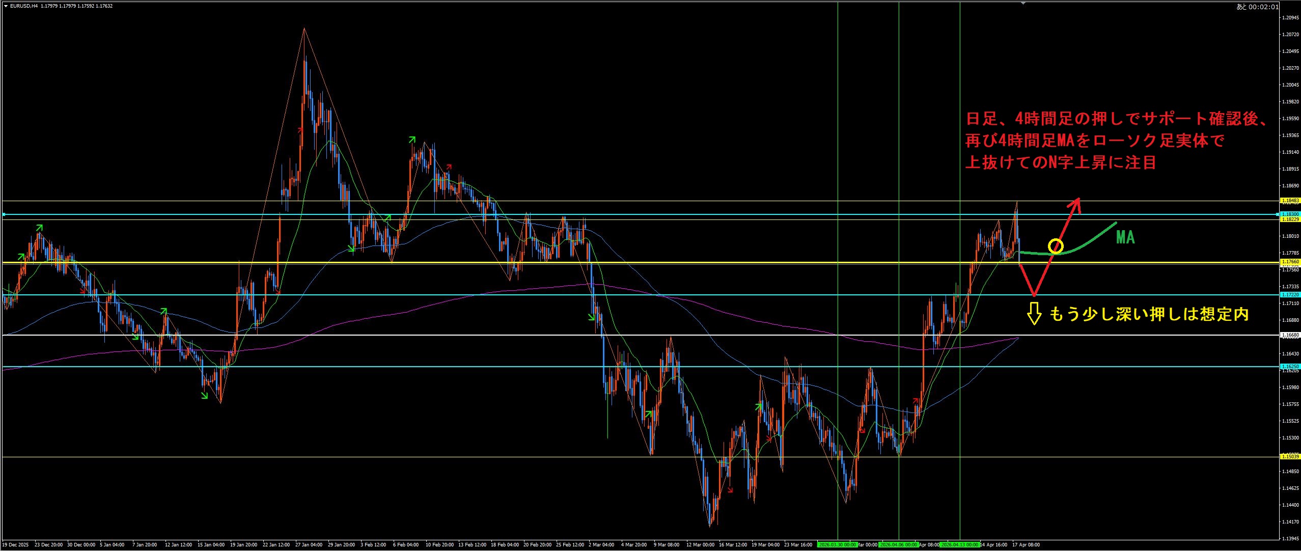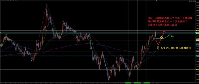 先週に引き続きユーロドルに注目です。一旦、押しとサポート確認後の4時間足MA上抜けに注目です。